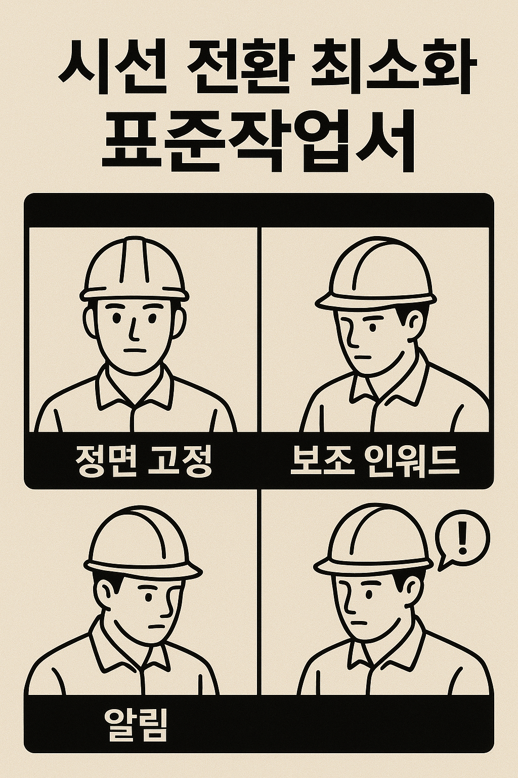 시선 전환 최소화 표준작업서: 정면 고정·보조 인워드·알림 규격