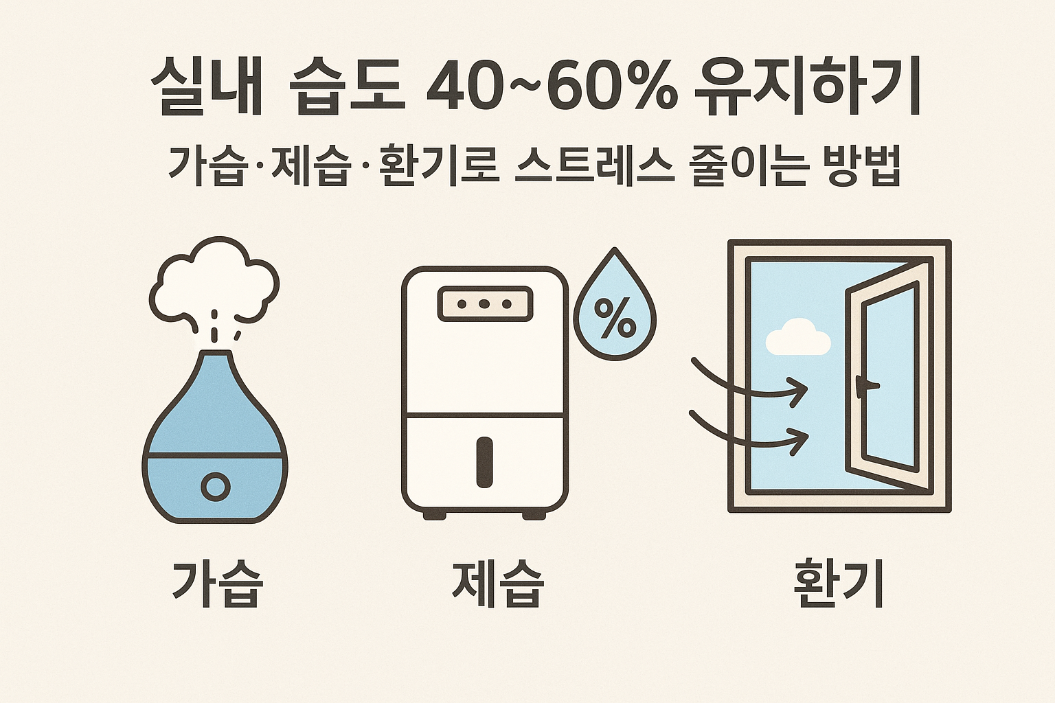 - 환기: 하루 1~2회, 10분 이상 교차환기. 실내외 습도 차를 확인해 효율적 시간대 선택.