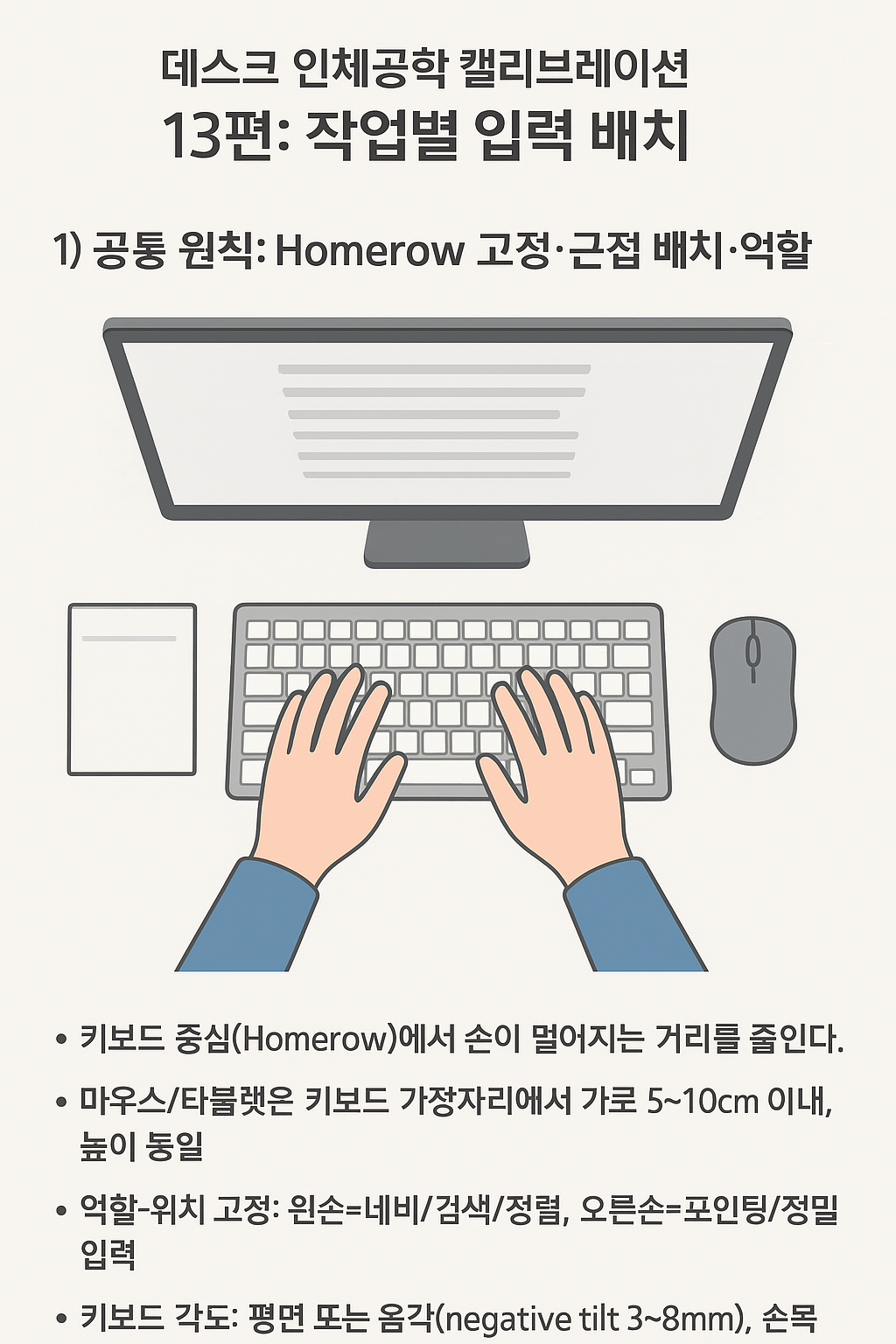 입력 장치의 물리 위치와 단축키 맵을 작업 유형에 맞춰 변환하면 손목 신전·편위 누적을 줄이고 전환 속도를 끌어올릴 수 있습니다. 본 가이드는 타이핑, 리뷰·읽기, 디자인·편집(펜/타블렛 포함), 회의 4가지 시나리오에서 재현 가능한 배치·각도·거리를 수치 중심으로 제시합니다.
