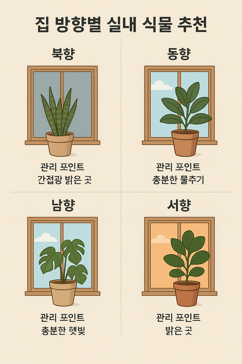 - 관리 포인트: 오후 직광은 유리창 차열필름·화이트 커튼 사용, 화분 위치는 창에서 50~100cm 후퇴
